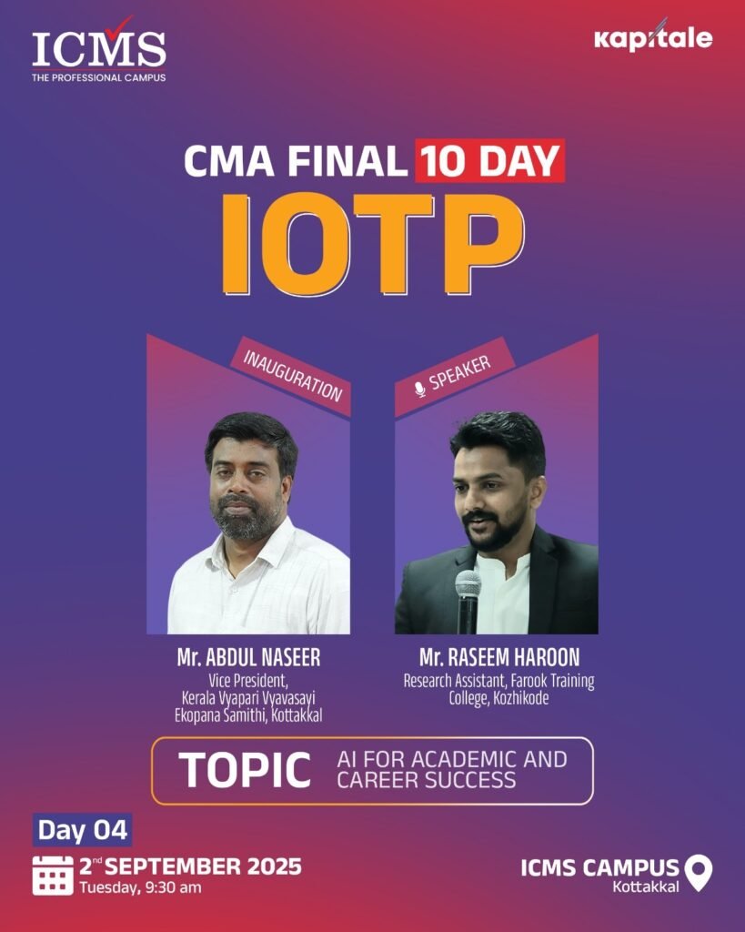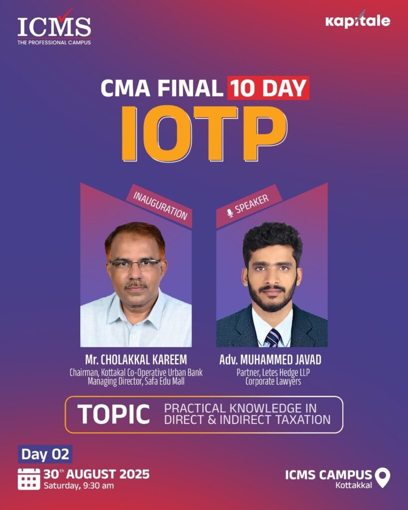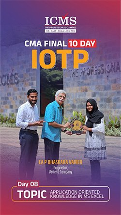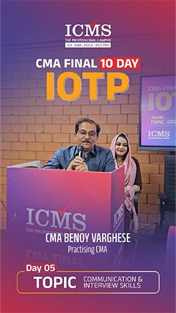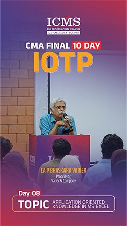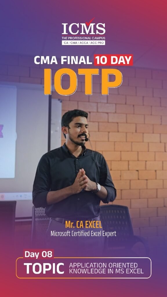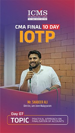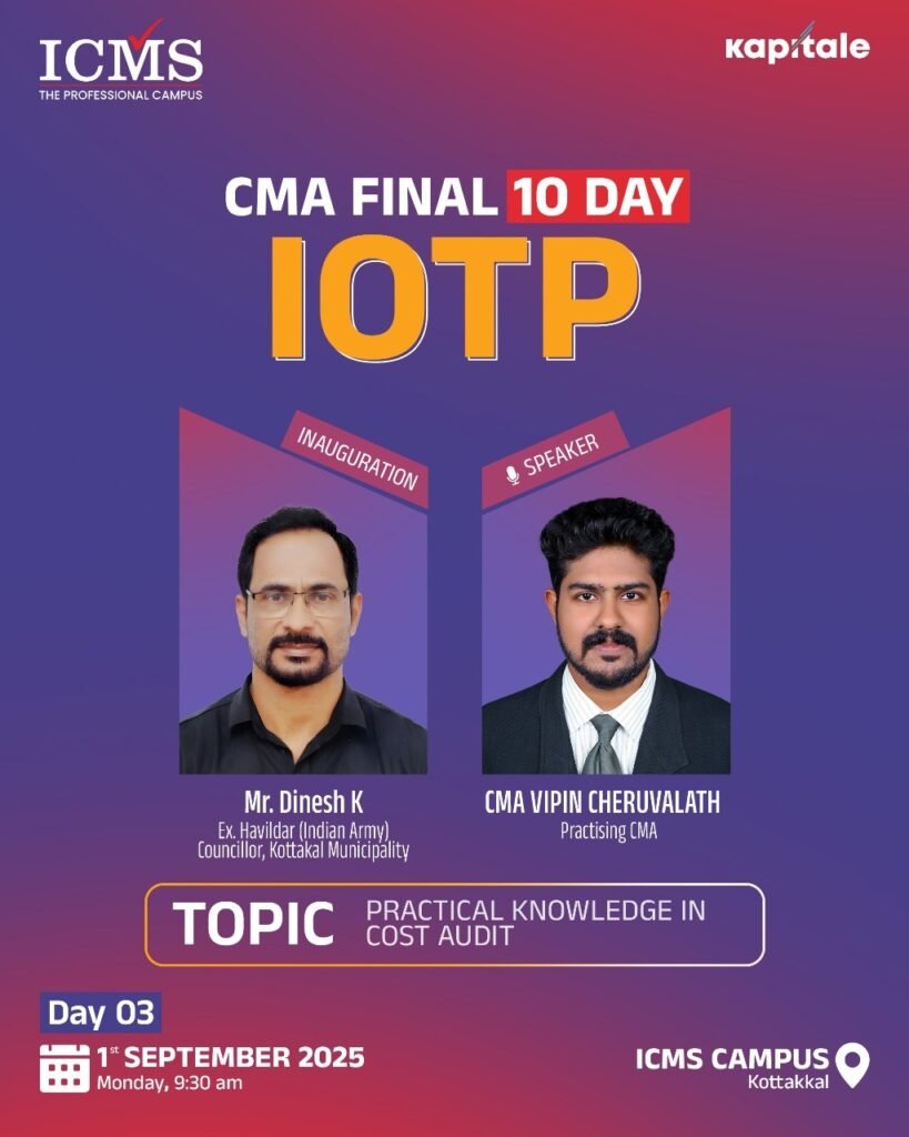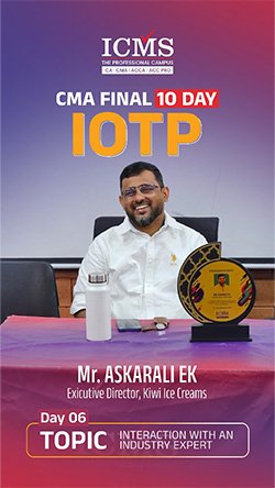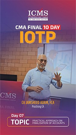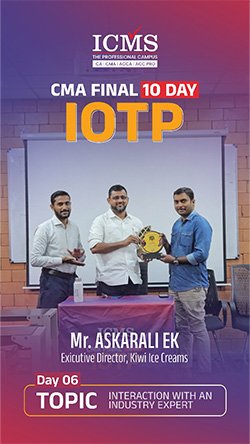 The Industry Oriented Training Programme (IOTP) curriculum is a ten-day training curriculum instructed by “The Institute of Cost & Management Accountants of India” for CMA Final students. The IOTP consists of seven days of practical topic instruction and three days of soft skill acquisition training. ICMS is the trendsetter among CMA training institutes in terms of offering the IOTP exactly as advised by the ICMAI.